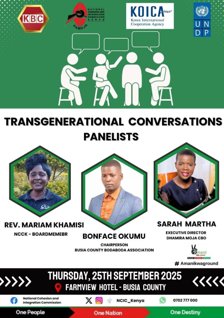 On 25th September, Busia County hosted the NCIC Transgenerational Conversations, broadcast live on KBC. The forum brought together youth, elders, civil society organizations, county officials and community actors to discuss the drivers of conflict, the barriers to inclusion and the shared agenda for peace in Busia County. NCIC reiterated its intent to listen, not provoke, offering a platform for open dialogue within safe boundaries.