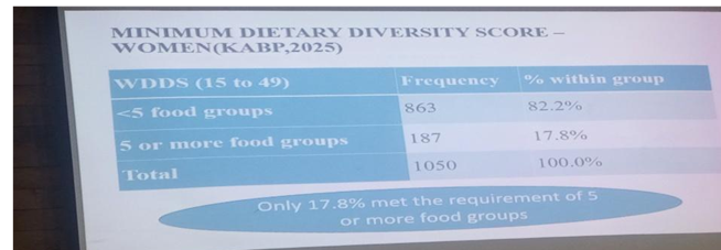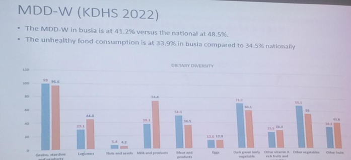 A mid-2025 survey among women of reproductive age in Busia County revealed that only 17.8% met the minimum dietary diversity of five food groups. Grain and starch consumption stood at 99%, but dietary diversity remains low.