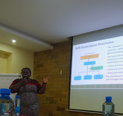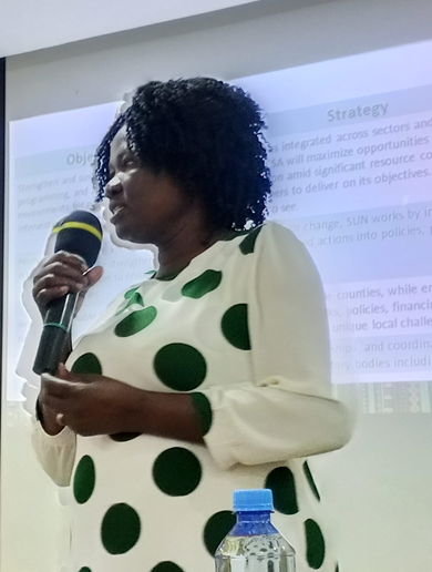 Ms. Maureene Ayodi presented an overview of the Scaling Up Nutrition Civil Society Alliance, noting that it is part of a global movement with a Kenyan chapter. The Busia County chapter has been operational for the past three years.